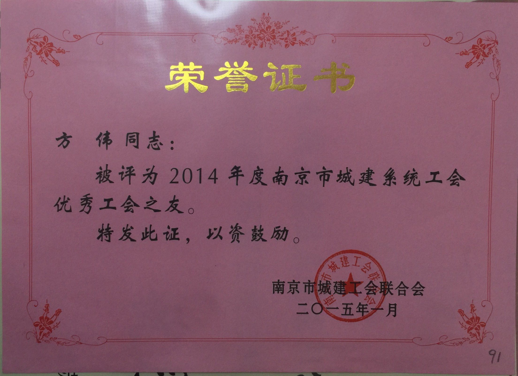 公司方偉被評(píng)為2014年度南京市城建系統(tǒng)...