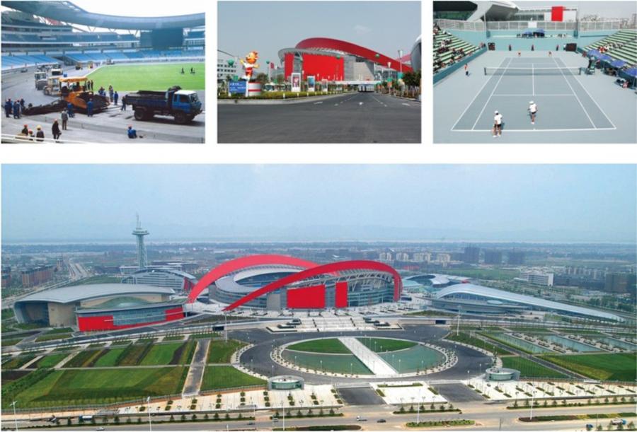 南京奧體中心工程是國家十運(yùn)會(huì)主場(chǎng)館,也是江蘇省重點(diǎn)工程,工期、質(zhì)量容不得一點(diǎn)馬虎。工程包括室內(nèi)室外場(chǎng)地及攤鋪任務(wù),以及主體育場(chǎng)、訓(xùn)練場(chǎng)、十二片網(wǎng)球場(chǎng)的結(jié)構(gòu)層施工任務(wù)。奧體中心室外瀝青砼、網(wǎng)球場(chǎng)瀝清砼等工程量小但要求極其嚴(yán)格,眾多瀝青砼生產(chǎn)公司受困于設(shè)備和技術(shù),知難而退。
