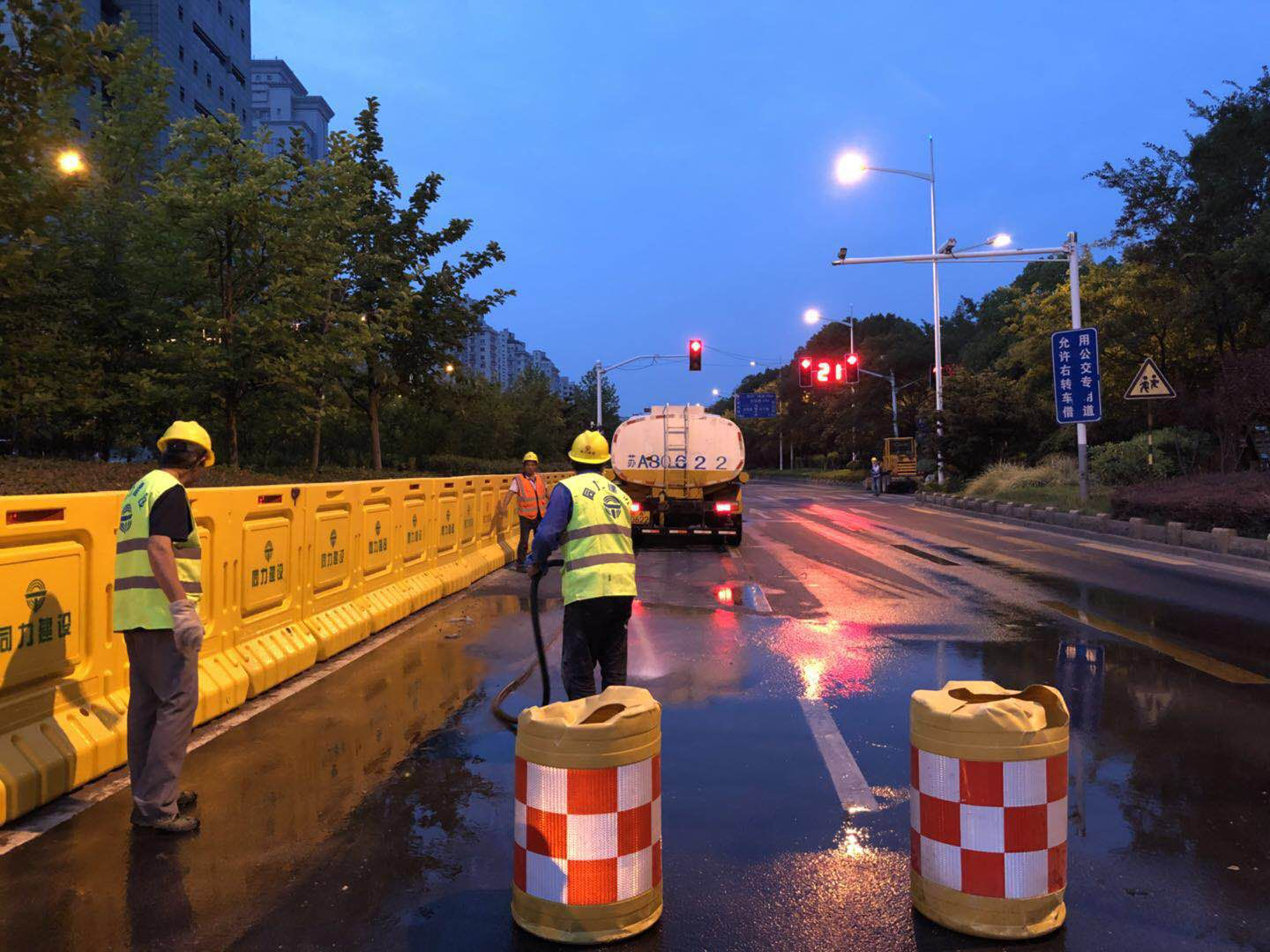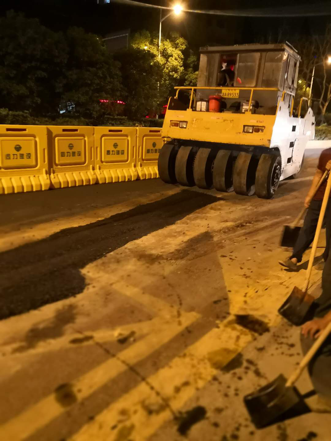 龍?bào)粗新氛沃凶畲箅y點(diǎn)在于承載交通壓力大,施工時(shí)間受很大約束。首先是每日的工作時(shí)間較短,雖前期做了大量溝通工作,但鑒于龍?bào)粗新肥浅鞘心媳毕蚪煌ù髣?dòng)脈,施工容易造成嚴(yán)重?fù)矶隆9首罱K只能在每日夜間21:00至次日凌晨6:00于進(jìn)行施工,其余時(shí)段均需保證全時(shí)段無(wú)占用通行。在復(fù)雜不利的環(huán)境下,緊抓“定時(shí)清場(chǎng)法”、施“單元施工法”不放松,將整條道大路劃分為十六個(gè)單元以便組織推業(yè)進(jìn)。每日夜間21:00圍擋設(shè)施、施工車(chē)輛等陸續(xù)進(jìn)場(chǎng),大批施工人員和交通疏導(dǎo)人員在各個(gè)單元就位,然后根據(jù)現(xiàn)場(chǎng)車(chē)流量情況試用圍擋封閉部分車(chē)道,并根據(jù)測(cè)試圍擋后車(chē)流通行效果靈活調(diào)整車(chē)道封閉時(shí)間以及車(chē)道封閉數(shù)量,在確認(rèn)不會(huì)造成交通堵塞之后再圍擋施工。見(jiàn)縫插針、統(tǒng)籌協(xié)調(diào)、調(diào)整工設(shè)序,努力做到化難點(diǎn)為亮點(diǎn)。為了確保白天可以順利開(kāi)放交通,提前擬定方案,將小面積難以壓實(shí)、大面積難以養(yǎng)生的水泥穩(wěn)定碎石道路基層處理方案,調(diào)整為小面積用砼澆筑覆蓋鋼板養(yǎng)護(hù)、大面積病害采用ATB瀝青碎石即壓即成型的方案,既保障了交通也保證了質(zhì)量。同時(shí)部署各單元作業(yè)班組集中力量在少量點(diǎn)位內(nèi)施工,開(kāi)一段干一段收一段,不多開(kāi)作業(yè)面,便于控制質(zhì)量和進(jìn)度,同時(shí)方便組織圍擋、開(kāi)放交通及白天的維護(hù)巡查;對(duì)于過(guò)路溝槽、病害處理的鋼板覆蓋措施,也有多項(xiàng)要求及改進(jìn)。首先是確保鋼板厚度不低于2厘米,并在鋼板下放置橡膠墊,減少車(chē)輛碾壓的噪音,鋼板四周還會(huì)設(shè)置減速帶起到警示過(guò)往車(chē)輛減速以及避免鋼板發(fā)生位移,其次是對(duì)于鋼板下脫全跨度大于1米的增設(shè)槽鋼支撐,并做到24小時(shí)人員巡視不間斷。與此同時(shí),周邊一些單位比較支持,騰出了一些空地給我們堆放材料,這樣在每天早上6點(diǎn)能確保圍擋和施工車(chē)輛等就近安放,恢復(fù)快車(chē)道交通。