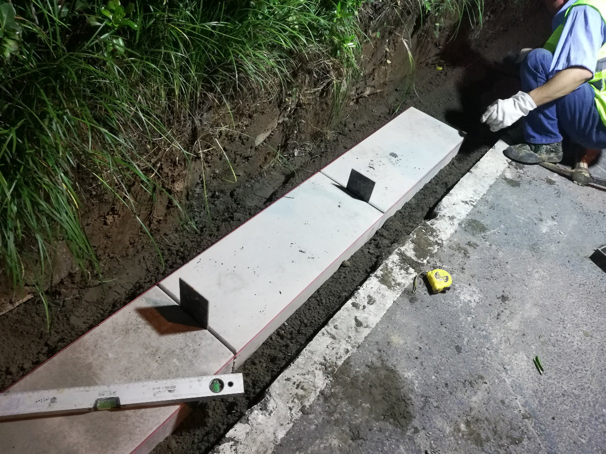 以路緣石縫隙為例,為了確保側(cè)平石的縫寬一致,外觀美觀,本次設(shè)計(jì)對(duì)側(cè)平石的縫寬都提了具體的要求:分別是側(cè)石縫寬2毫米,平石縫寬5毫米。為了保證作業(yè)班組能?chē)?yán)格達(dá)到這個(gè)要求,項(xiàng)目部要求作業(yè)班組定制卡尺進(jìn)行施工控制?,F(xiàn)場(chǎng)實(shí)施中5毫米的卡尺因厚度剛度足夠,能順利使用;但2毫米的卡尺卻因?yàn)樘∪菀鬃冃巍_@個(gè)難題如何解決?在現(xiàn)場(chǎng)研究后,發(fā)現(xiàn)花治崗巖材料的打包帶厚度剛好是2毫米,于是作業(yè)班組采用剪短的折打包帶作為卡尺,既方便有效,還起到變廢為寶的效果。